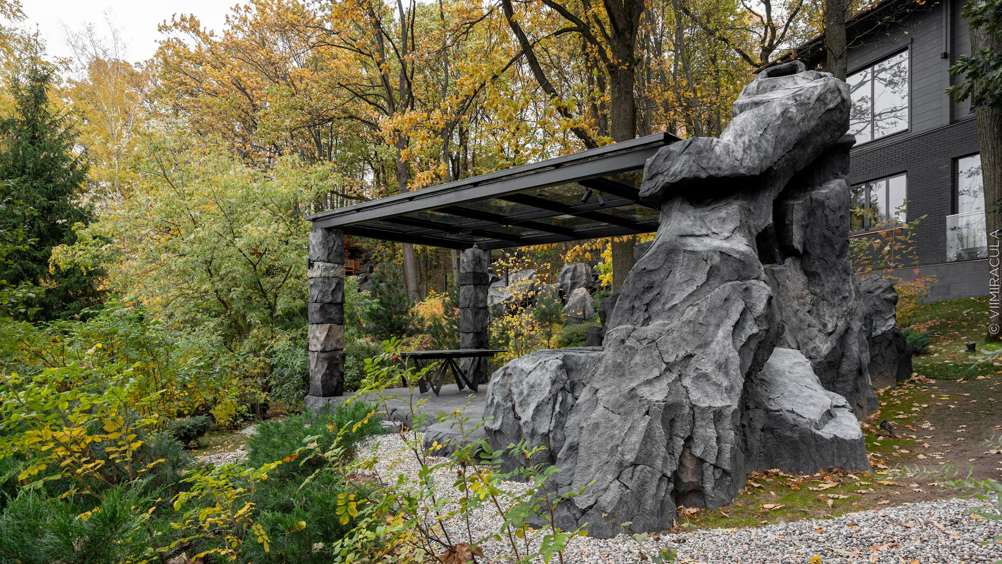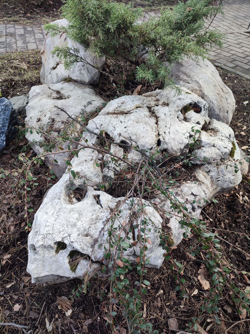 Сами по себе камни так же могут стать акцентными точками. Максимально выигрышно выглядят большие валуны или группы камней разного размера и формы. Если привезти на участок валун определённой породы, формы и размера может быть затруднительно, то есть другой вариант – камни из архитектурного бетона. Они выглядят очень реалистично, при качественном изготовлении их невозможно отличить от природных. И со временем различные мхи и насекомые с удовольствием обживают каменную скульптуру, превращая в природный объект.