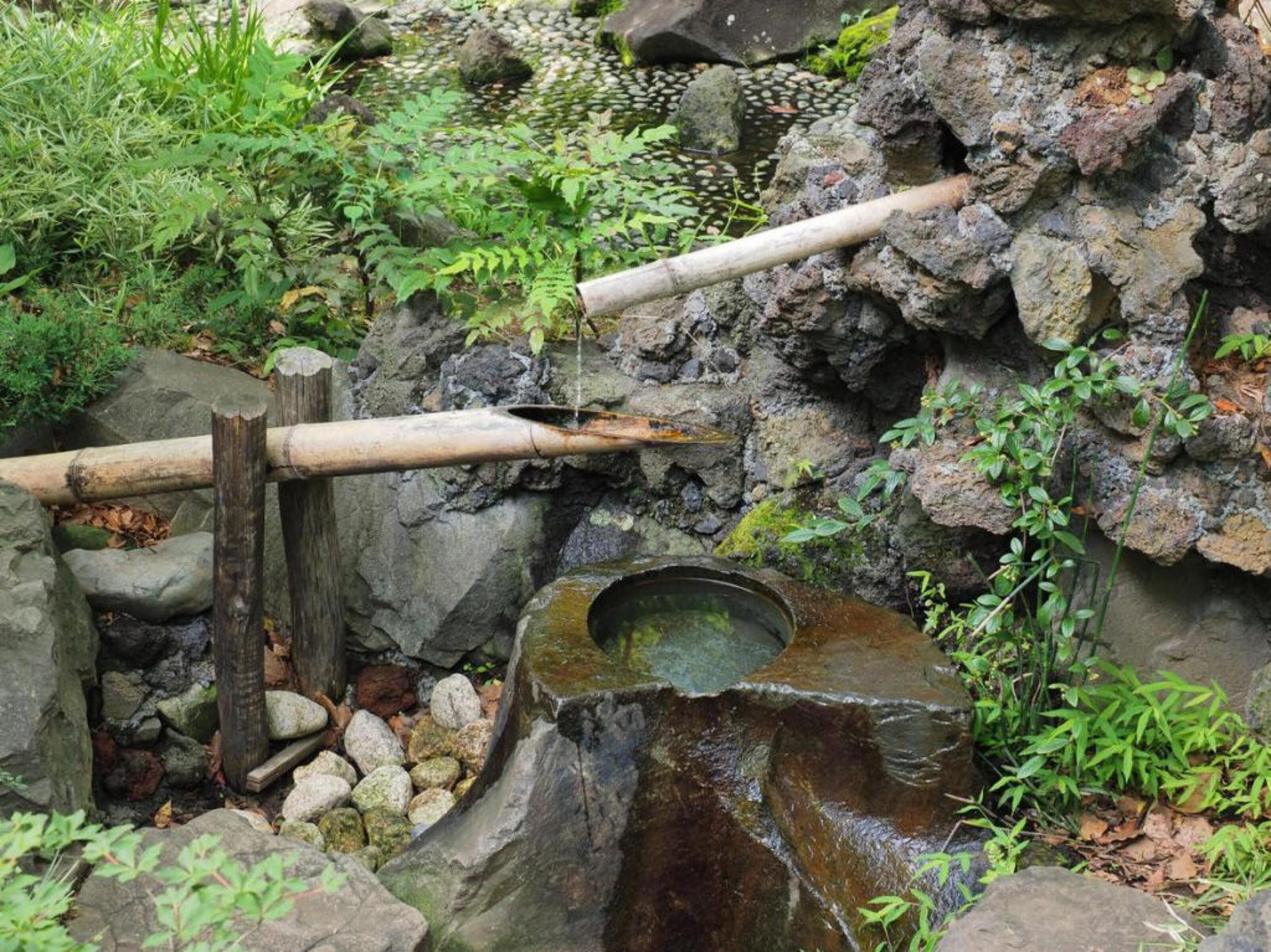 Содзу – японское изобретение, мини фонтан. Бамбуковая трубочка наполняется водой, падает на камень и издаёт звук, отпугивая птиц-вредителей.