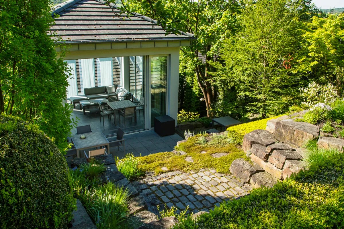 В собственном саду Берга в Зинциге, над которым он работает более 35 лет, ключевой элемент — сухая кладка: подпорные стены из камня, уложенного без раствора.