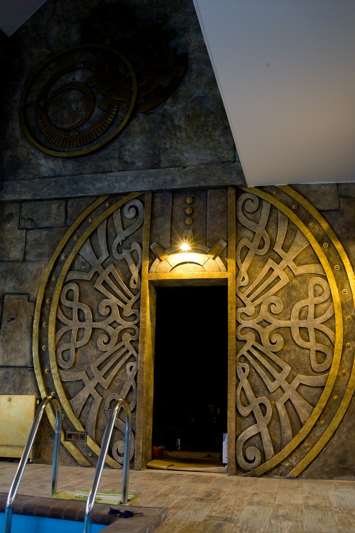 Один из самых необычных проектов, с которыми мы работали, – это оформление интерьера в духе стимпанк. Заказчику пришлось по душе это направление в литературе, и он захотел использовать его атмосферу в интерьере бассейна.