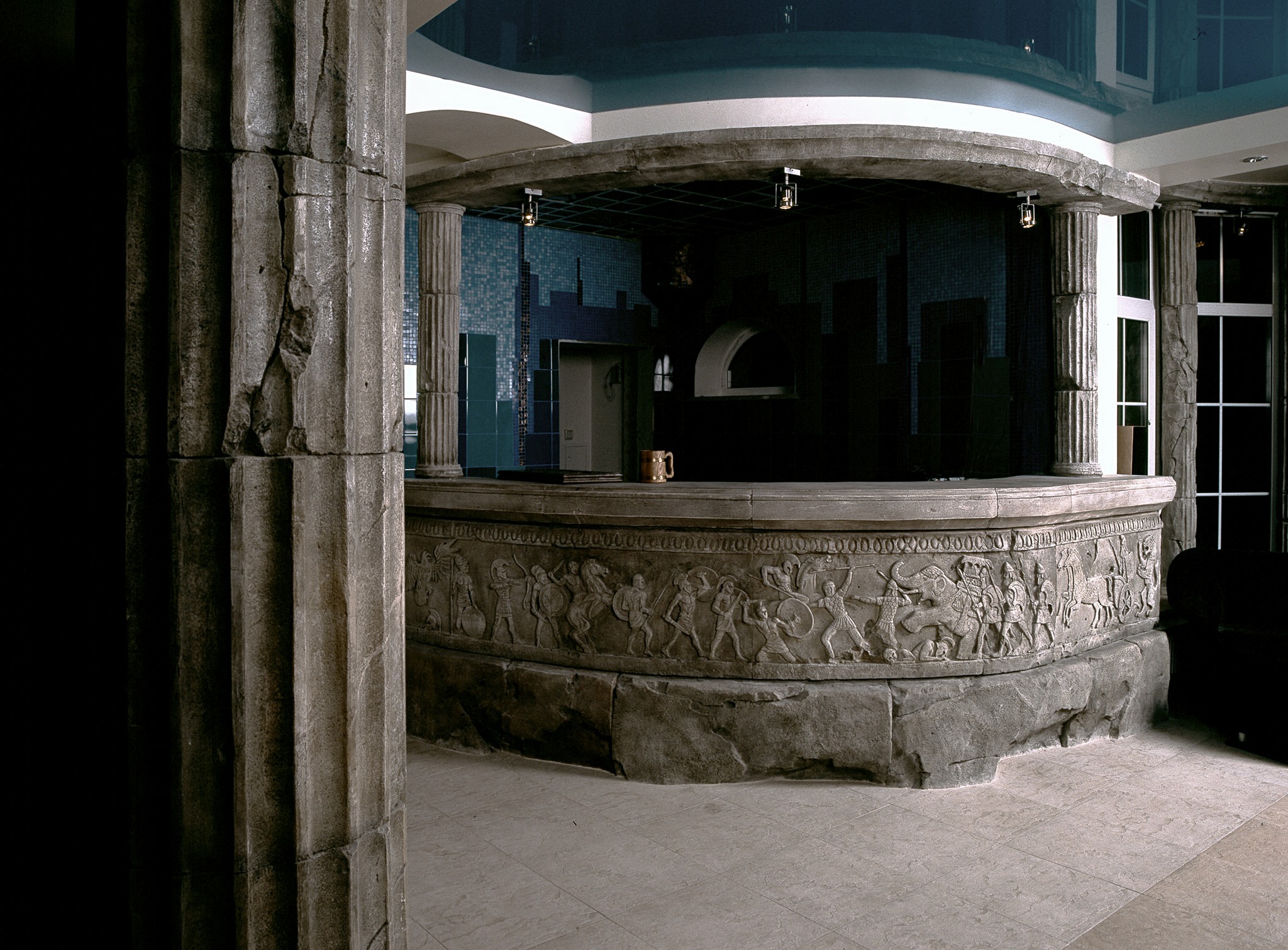 Из коридора человек попадает в настоящую пещеру. Это грот, из которого можно пройти в бассейн, баню и бар. Античные колоннады, барная стойка с лепным изображением гладиаторских боев и римским орнаментом органично сочетаются – интерьер выдержан в одном ключе.