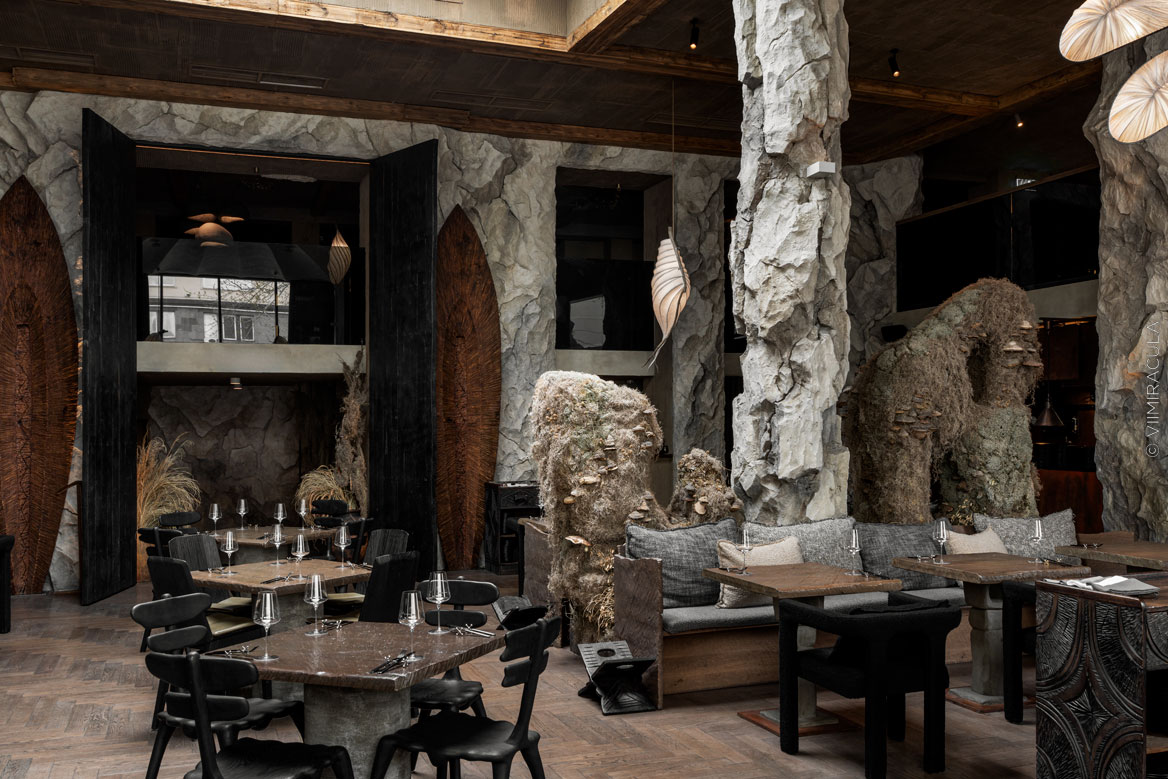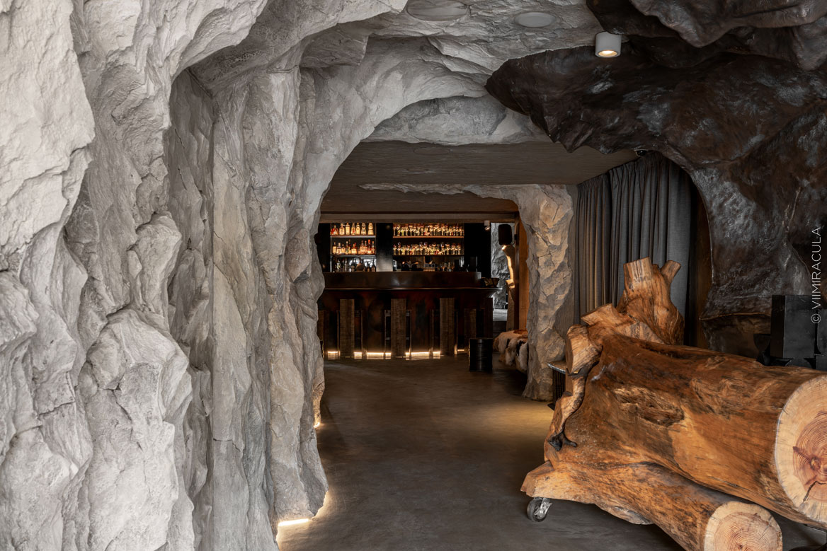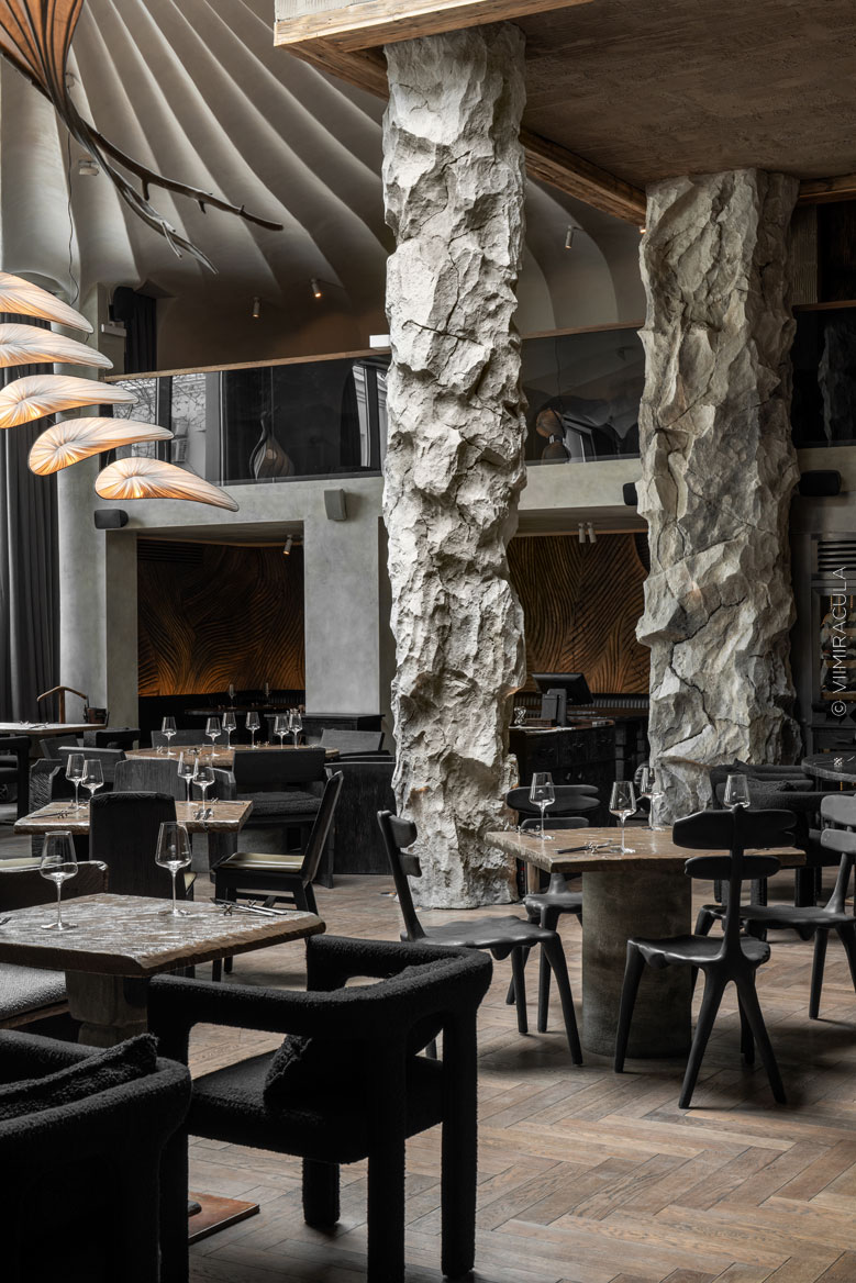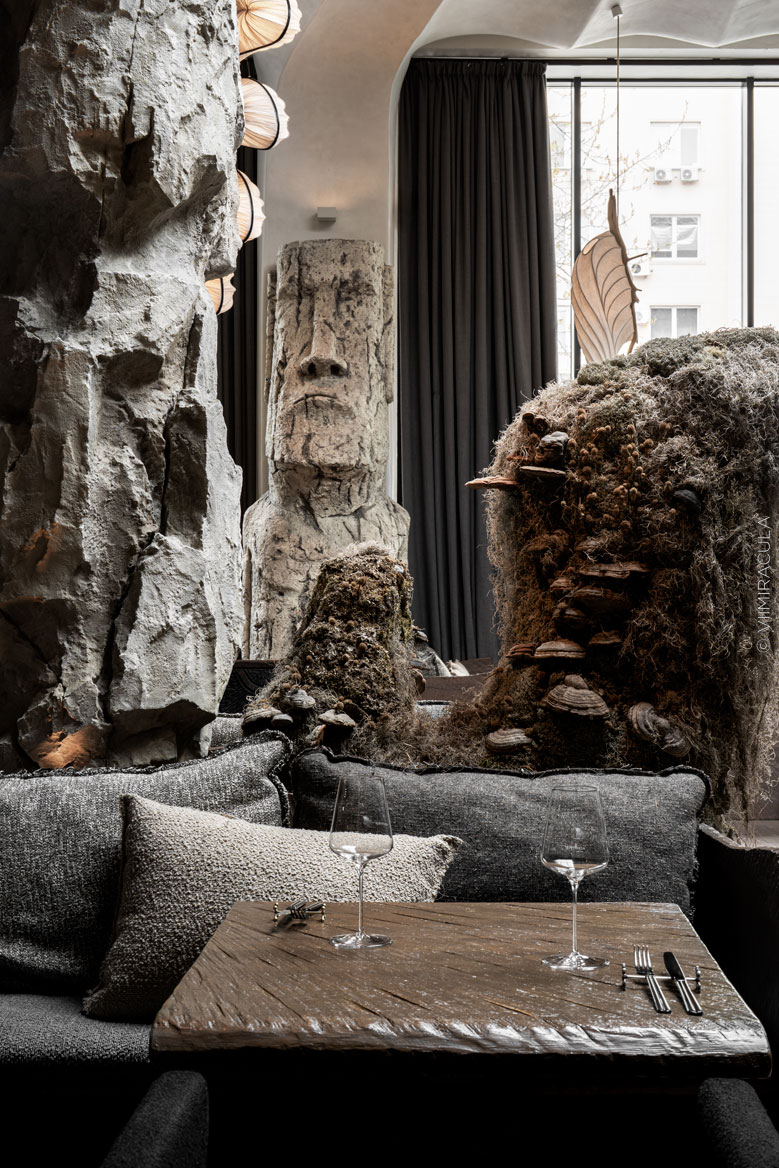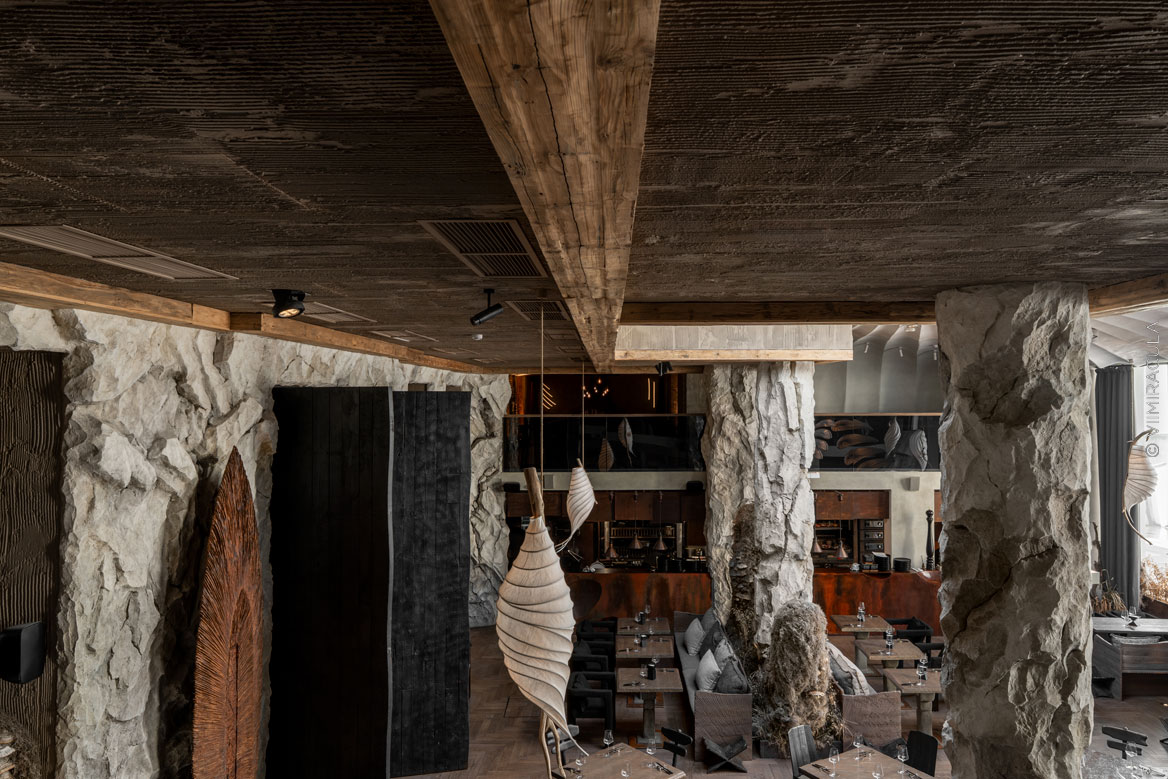 При входе нас встречает настоящая пещера, где каменные своды ведут в широкие залы, словно рассказывая историю человечества. В ресторане предусмотрены четыре зоны для гостей: «храм», «грот», «пещера» и «Каминный зал». Каждое пространство несёт собственную эстетику, продолжая общую концепцию – путешествие к истокам Земли, к природным формам и первобытной жизни.Пройдя водную зону в виде грота, посетители попадают в большой зал «Пантеон» с огромными окнами. Атмосфера далёкого прошлого поддерживается при помощи шкур животных, панно из мха и грибов, гигантских каменных фигур, созданных жителями острова Пасхи.
