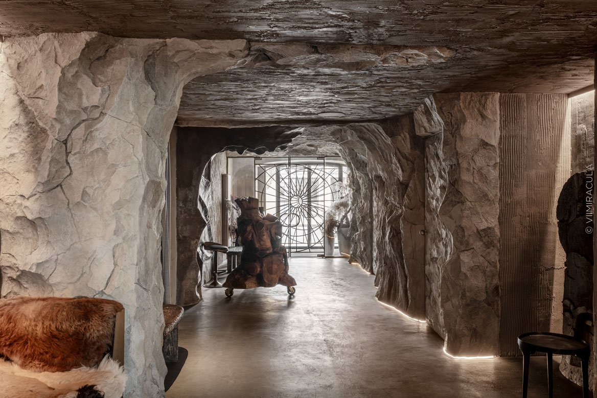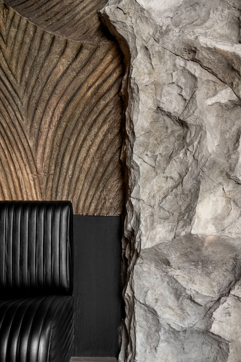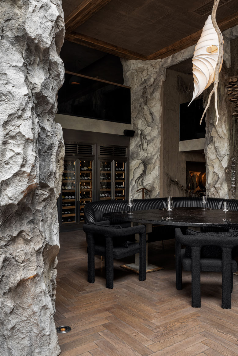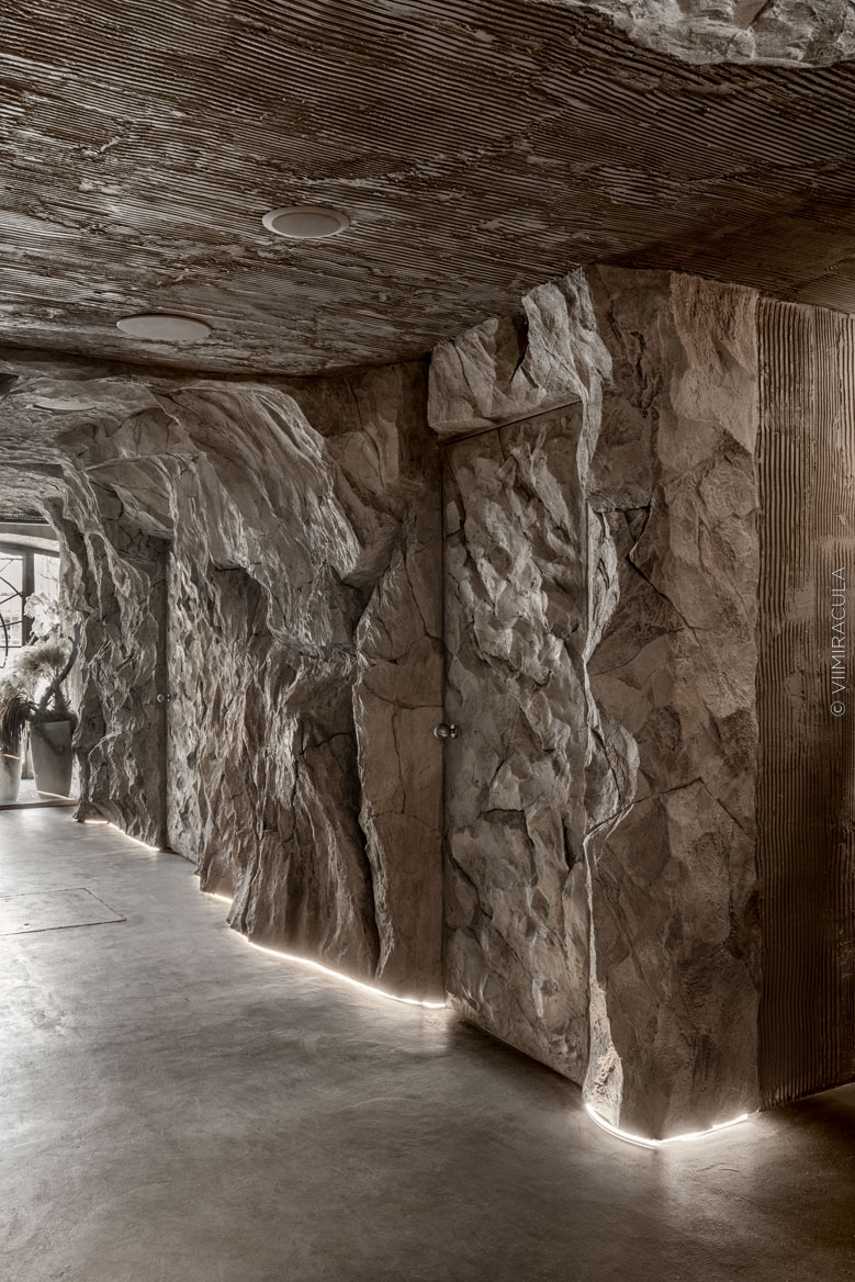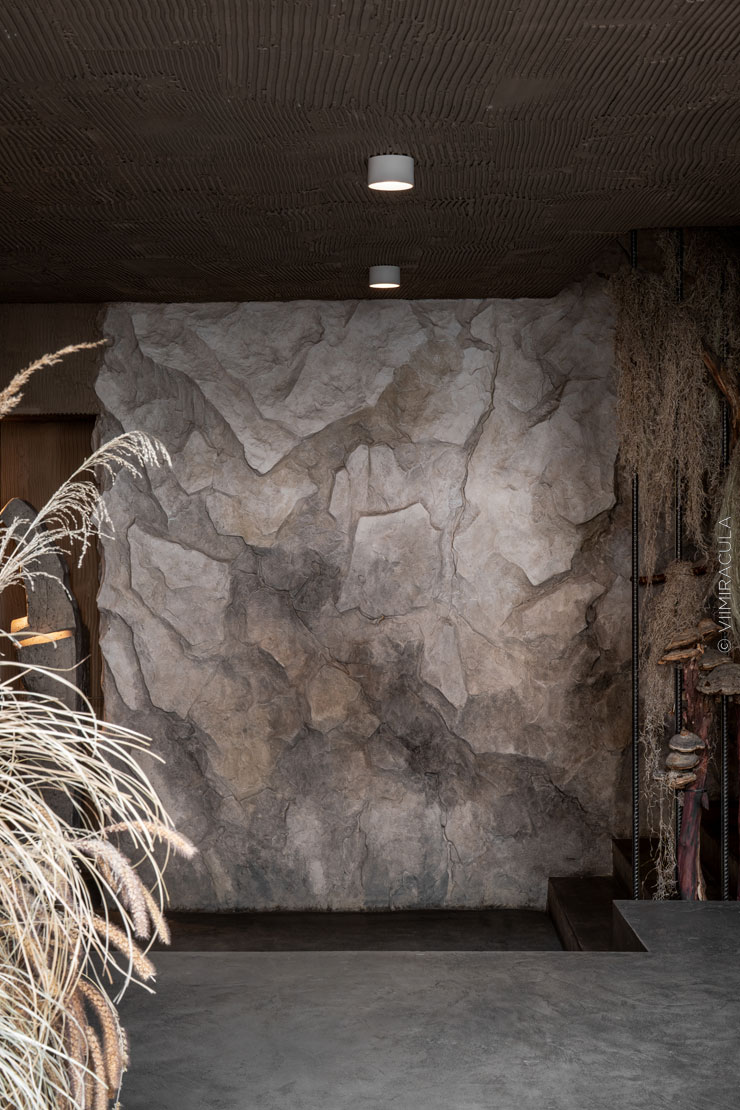 При входе нас встречает настоящая пещера, где каменные своды ведут в широкие залы, словно рассказывая историю человечества. В ресторане предусмотрены четыре зоны для гостей: «храм», «грот», «пещера» и «Каминный зал». Каждое пространство несёт собственную эстетику, продолжая общую концепцию – путешествие к истокам Земли, к природным формам и первобытной жизни.Пройдя водную зону в виде грота, посетители попадают в большой зал «Пантеон» с огромными окнами. Атмосфера далёкого прошлого поддерживается при помощи шкур животных, панно из мха и грибов, гигантских каменных фигур, созданных жителями острова Пасхи.
