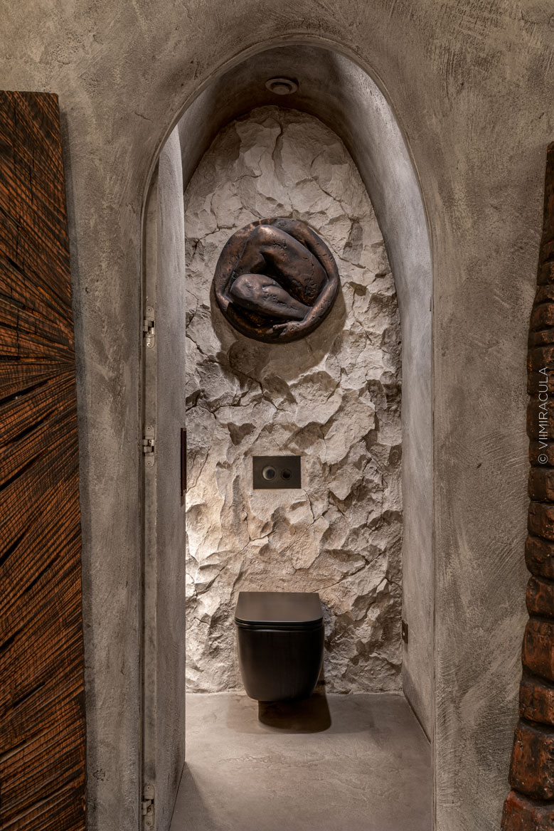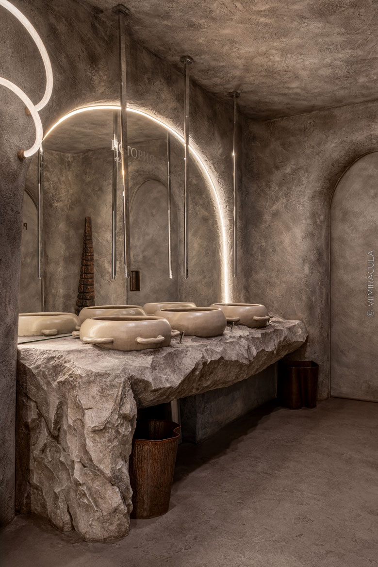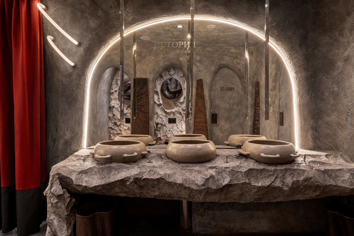 Уборная ресторана — это часть концептуального оформления заведения, которое сочетает элементы первобытной культуры и современные дизайнерские решения. Посетители заведения признали эту зону «самой эффектной». Стены с грубой рельефной поверхностью контрастируют со скальными барельефами, их фактурность подчеркивается незаметными светильниками.