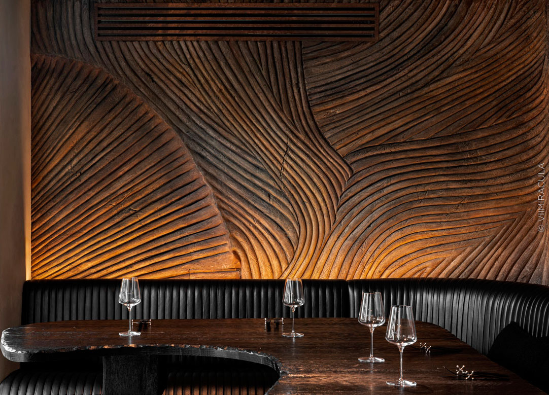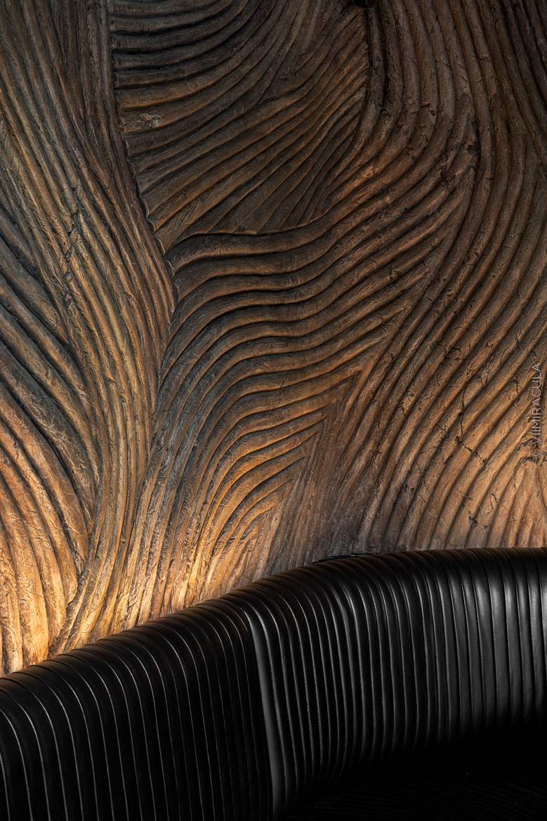 Результат: мастера VII MIRACULA наполнили интерьер акцентами и деталями – выполнили отделку стен и колонн на обоих этажах и лестнице, оформили входную зону, бары и санузлы. В одной из зон скульпторы выполнили резное объемное панно. Все декоративные работы выполнены вручную.