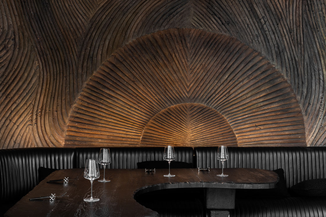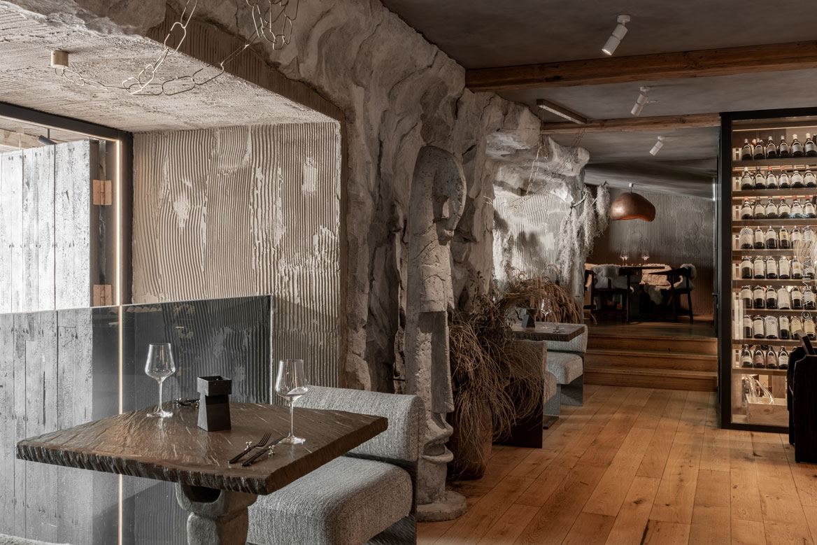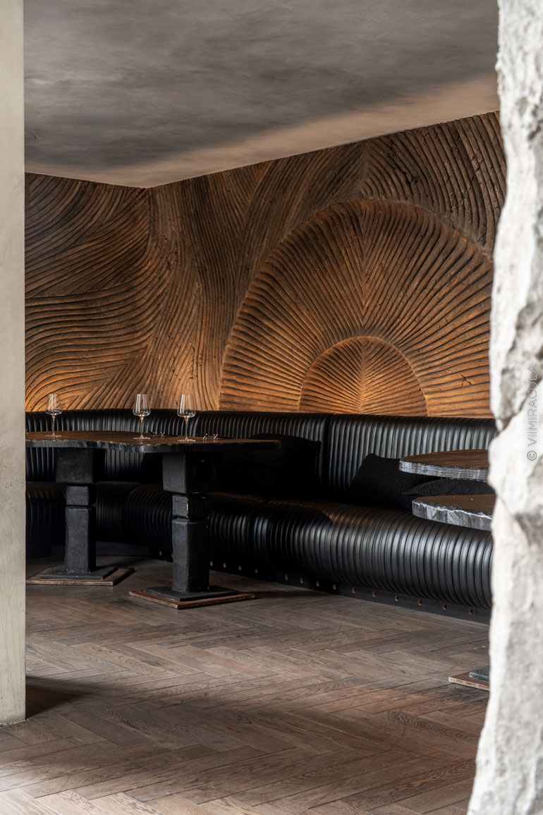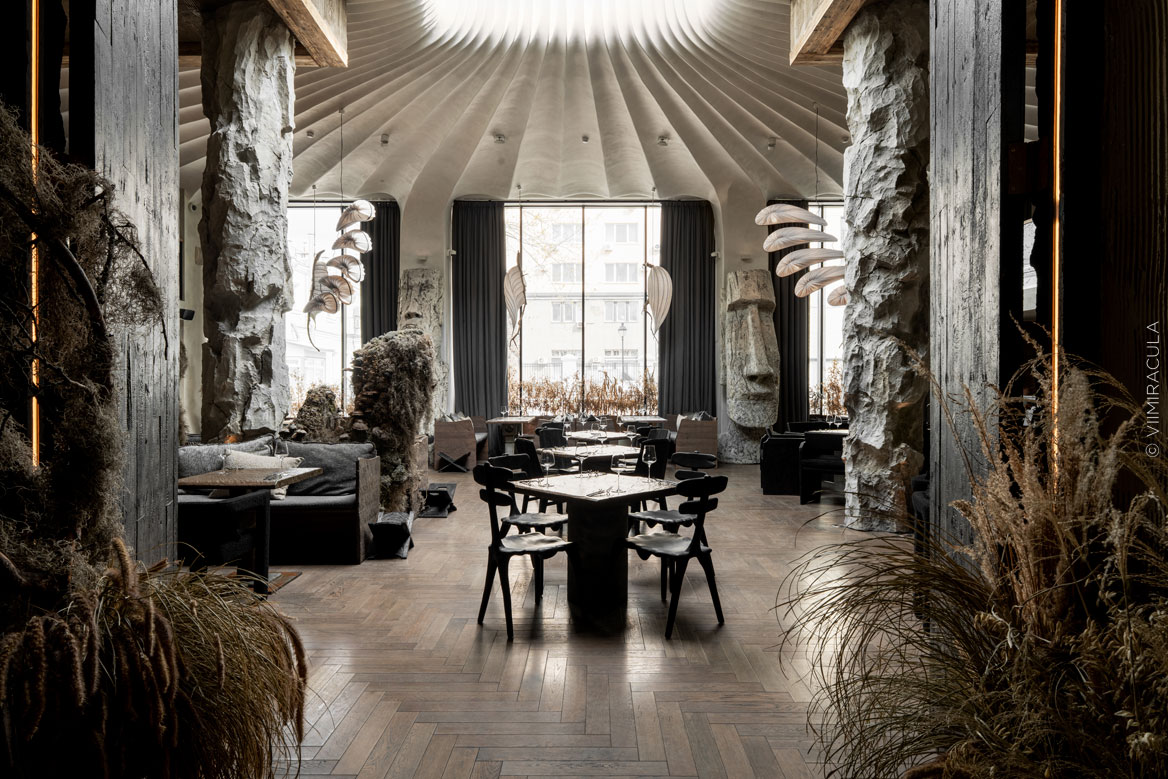 Так родился концепт: ресторан как первобытная пещера, в которой дизайн играет ключевую роль. Как говорят авторы идеи — архитектурное бюро DBA Group: «Нас вдохновили и впечатлили слова Сары Бернар: «Гостеприимство — качество, которое складывается из первобытной простоты и античного величия».