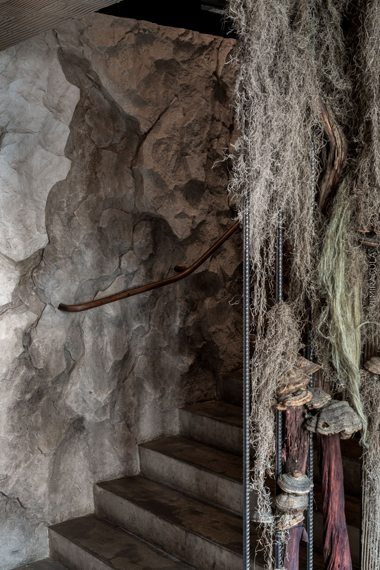 Лестница, ведущая на второй этаж, идет вдоль диких скал. Здесь помещение начинает напоминать кулуары театра — повсюду нас окружают богатые декорации. Задача, стоящая перед Студией Семь чудес, создать нечто уникальное, была успешно выполнена.