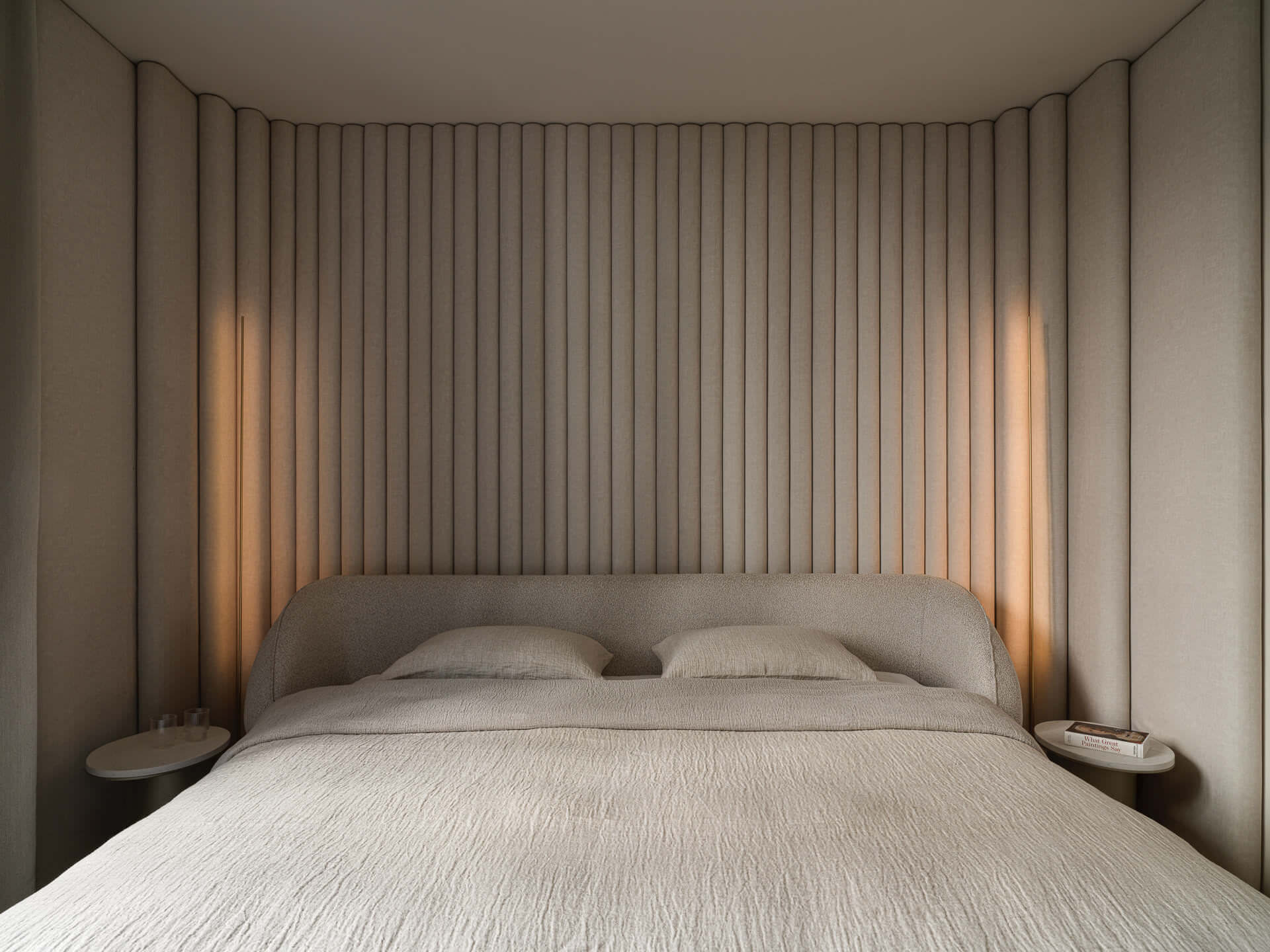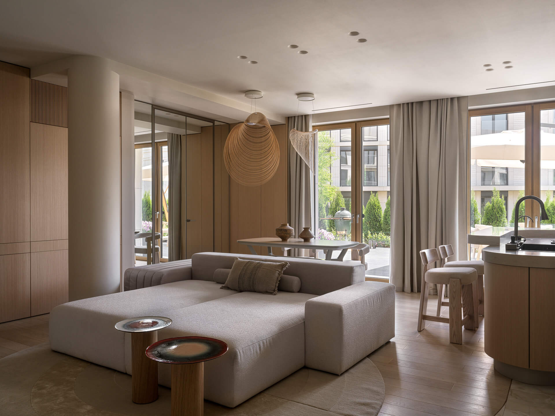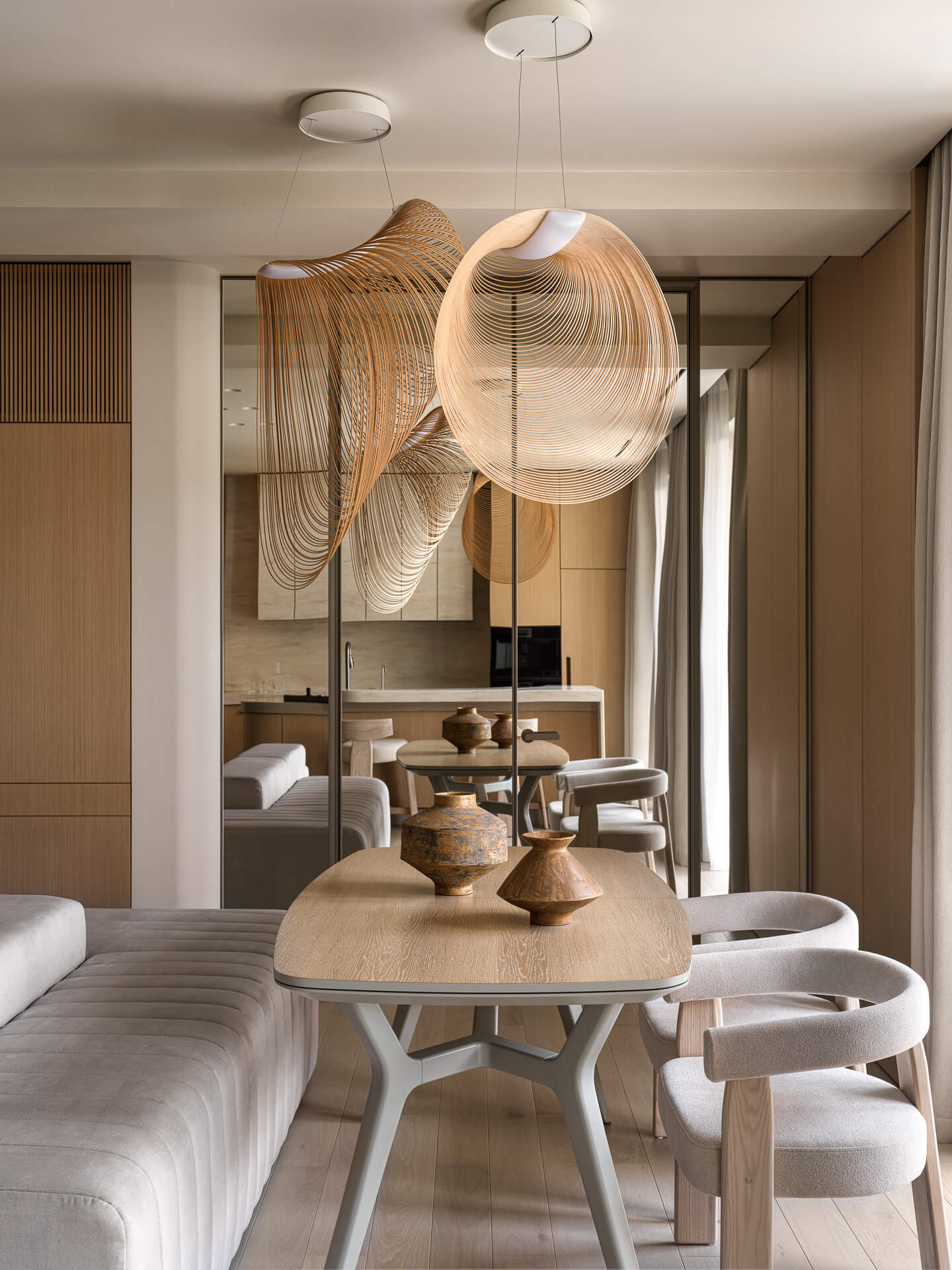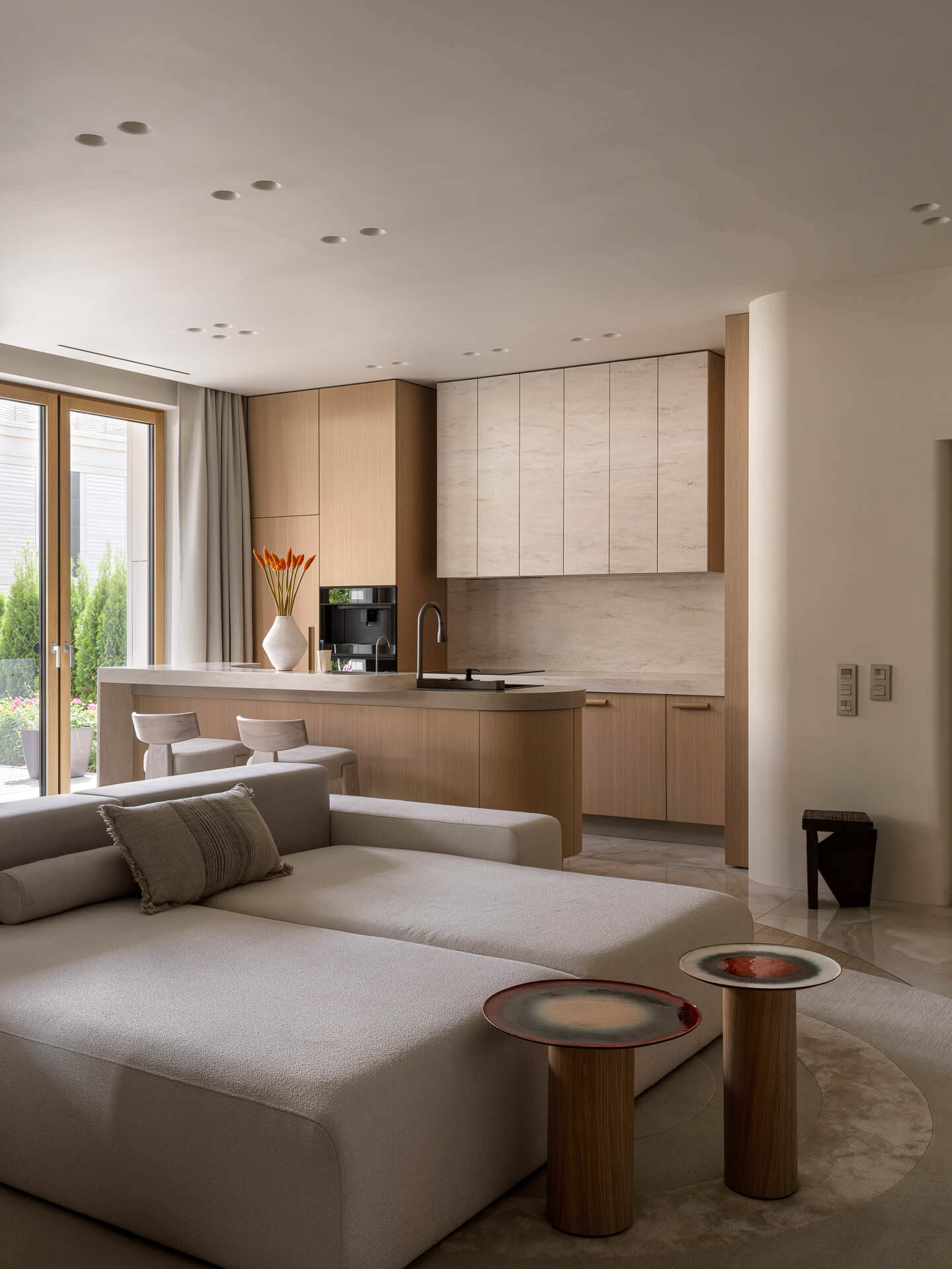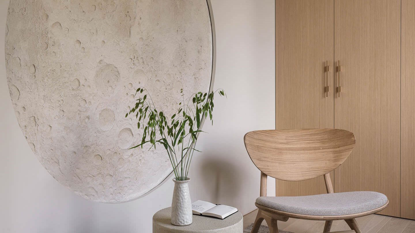 Цветовая гамма интерьера осталась классической — спокойные оттенки бежа. Никакого визуального шума, чистая эстетика джапанди. В таком стиле, где ценятся естественность и тактильность, природная скульптура дополняет пространство, превращая квартиру из уютной в по-настоящему индивидуальную.