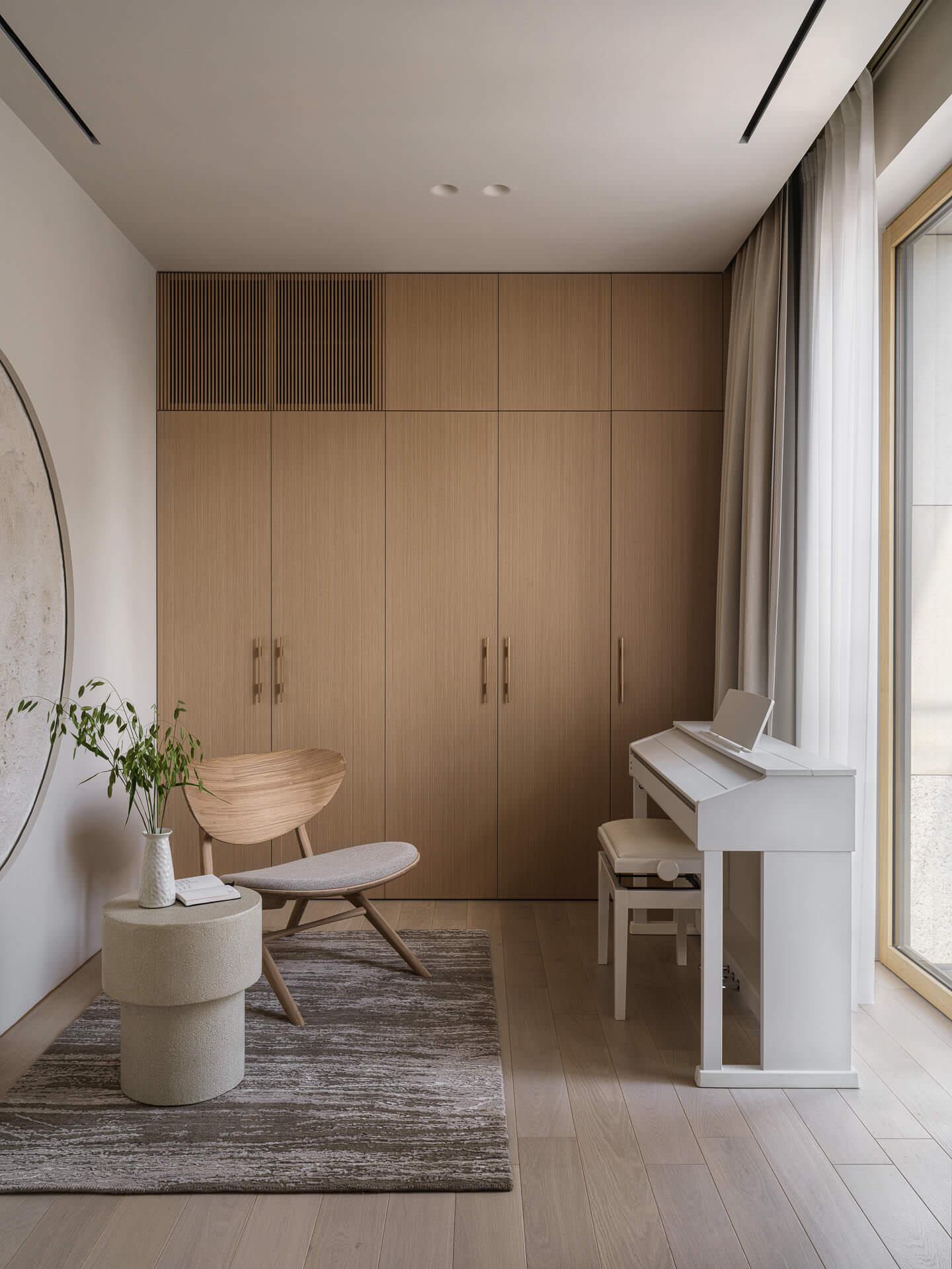 Судьба маленькой комнаты в этом проекте менялась не раз. Она побывала залом для йоги, местом для расслабления и даже гардеробной. Но когда встал вопрос о том, куда разместить пианино — ему нашлось место здесь.