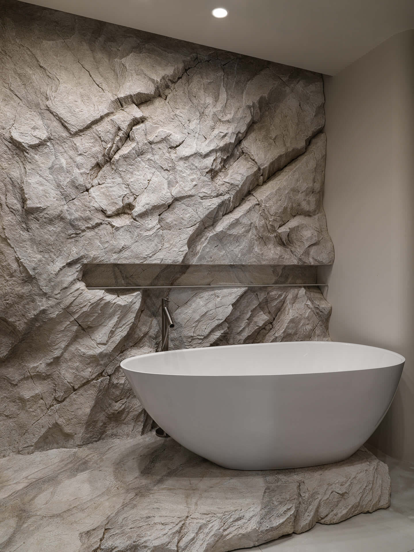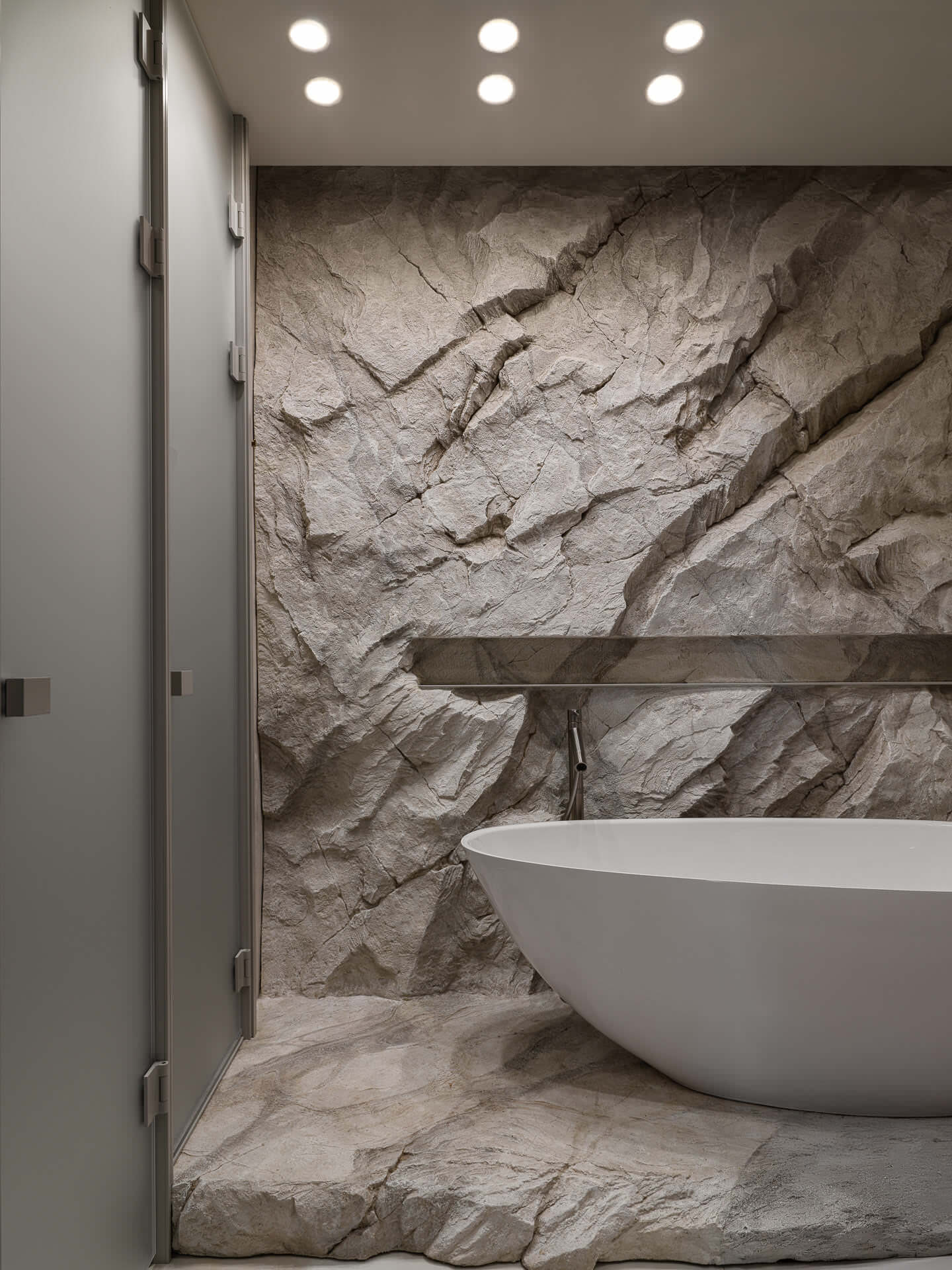 Особое внимание уделено созданию фактуры: поверхность скалы зачищена вручную, камень выглядит диким, но на ощупь он бархатистый и приятный, словно отполированный морем. Здесь свет, цвет и материалы работают в унисон — идеальное место, чтобы снять стресс и расслабиться. Тебя словно возвращают в лоно природы.