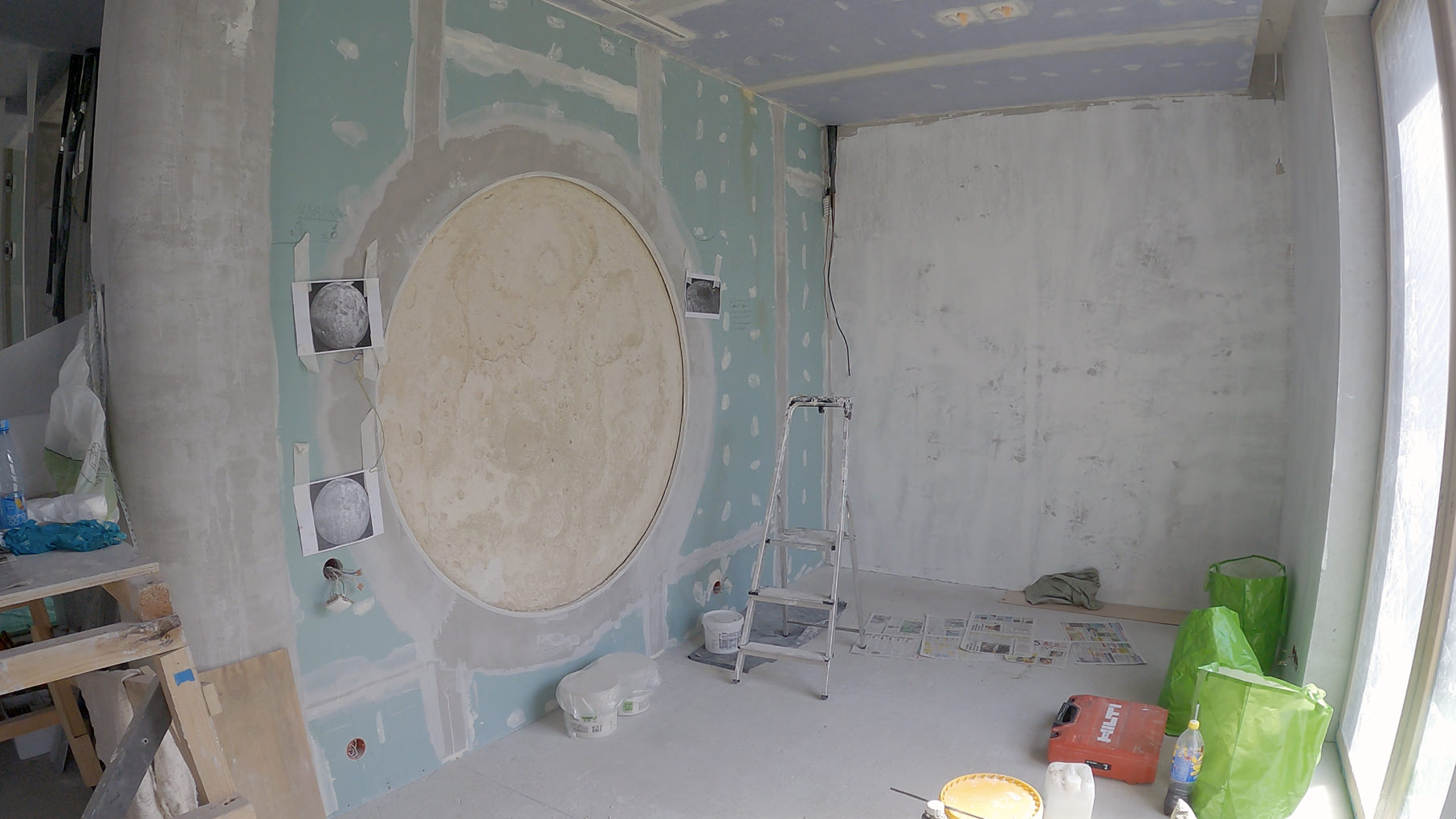 Так родился музыкальный салон. Его абсолютная доминанта — панно «Луна». Главный мотив интерьера — круг. Он повторяется в отделке стен, лунном панно, очертаниях мебели, плавных линиях светильников. Панно из гипса с мягким, едва выступающим рельефом при дневном свете почти растворяется в стене, но стоит включить встроенную подсветку — и комната наполняется призрачным сиянием.